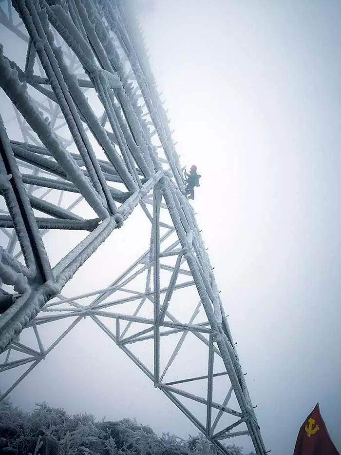 Un equipo de transmisión de energía en Zunyi, Guizhou, quedó cubierto por el hielo y la nieve.