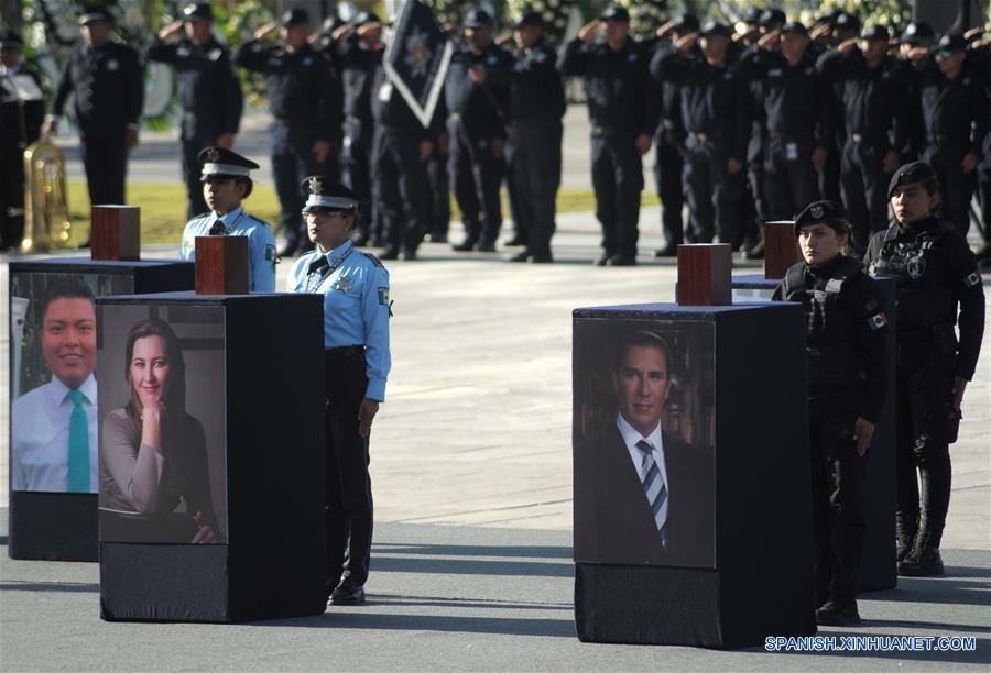 Elementos de seguridan trasladan las urnas que contienen las cenizas de la gobernadora del estado de Puebla, Martha Erika Alonso y su esposo, el senador Rafael Moreno Valle, así como tripulantes que viajaban en el helicóptero accidentado, para su ceremonia luctuosa en la Plaza de la Victoria, en el estado de Puebla, México, el 25 de diciembre de 2018. De acuerdo con información de la prensa local, familiares, amigos y figuras políticas acudieron el martes a la Plaza de la Victoria para rendir homenaje a la gobernadora del estado de Puebla, Martha Erika Alonso y su esposo, el senador Rafael Moreno Valle, quienes perdieron la vida el lunes tras desplomarse el helicóptero que los transportaba. (Xinhua/Fernando Camacho)