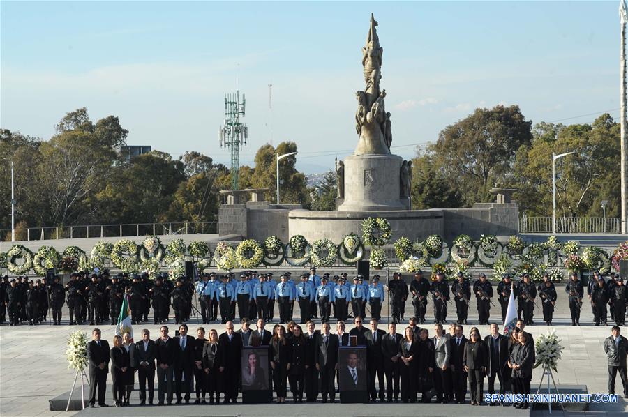 Elementos de seguridan montan guardia frente a las urnas que contienen las cenizas de la gobernadora del estado de Puebla, Martha Erika Alonso y su esposo, el senador Rafael Moreno Valle, así como tripulantes que viajaban en el helicóptero accidentado, durante su ceremonia luctuosa en la Plaza de la Victoria, en el estado de Puebla, México, el 25 de diciembre de 2018. De acuerdo con información de la prensa local, familiares, amigos y figuras políticas acudieron el martes a la Plaza de la Victoria para rendir homenaje a la gobernadora del estado de Puebla, Martha Erika Alonso y su esposo, el senador Rafael Moreno Valle, quienes perdieron la vida el lunes tras desplomarse el helicóptero que los transportaba. (Xinhua/Fernando Camacho)