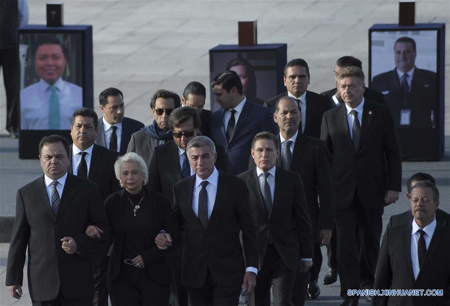 Integrantes del Gobierno de México participan durante el homenaje luctuoso de la gobernadora del estado de Puebla, Martha Erika Alonso y su esposo, el senador Rafael Moreno Valle, en la Plaza de la Victoria, en el estado de Puebla, México, el 25 de diciembre de 2018. De acuerdo con información de la prensa local, familiares, amigos y figuras políticas acudieron el martes a la Plaza de la Victoria para rendir homenaje a la gobernadora del estado de Puebla, Martha Erika Alonso y su esposo, el senador Rafael Moreno Valle, quienes perdieron la vida el lunes tras desplomarse el helicóptero que los transportaba. (Xinhua/Fernando Camacho)