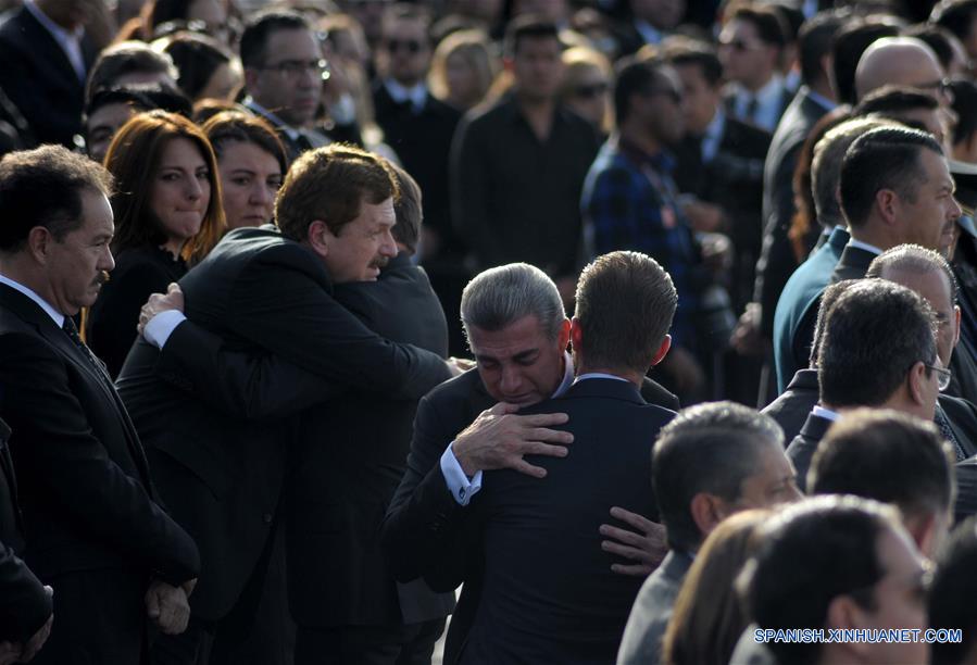 PUEBLA, diciembre 25, 2018 (Xinhua) -- Familiares y amigos reaccionan durante el homenaje luctuoso de la gobernadora del estado de Puebla, Martha Erika Alonso y su esposo, el senador Rafael Moreno Valle, en la Plaza de la Victoria, en el estado de Puebla, México, el 25 de diciembre de 2018. De acuerdo con información de la prensa local, familiares, amigos y figuras políticas acudieron el martes a la Plaza de la Victoria para rendir homenaje a la gobernadora del estado de Puebla, Martha Erika Alonso y su esposo, el senador Rafael Moreno Valle, quienes perdieron la vida el lunes tras desplomarse el helicóptero que los transportaba. (Xinhua/Fernando Camacho)