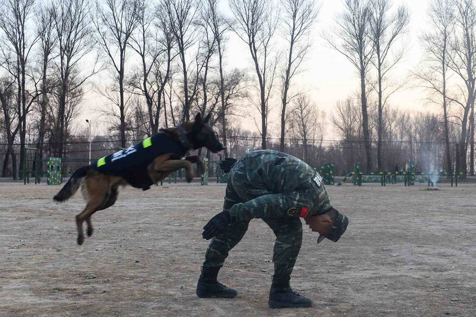 El perro policía Xinqing trabaja junto a Hao Zhongqiang. [Foto: Yuan Haoxiang/ Chindaily.com.cn]