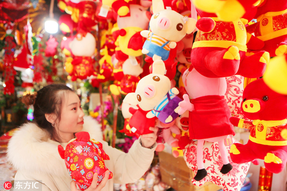 Una clienta elige una mascota con forma de cerdo en una tienda, el 17 de diciembre de 2018. [Foto / IC]