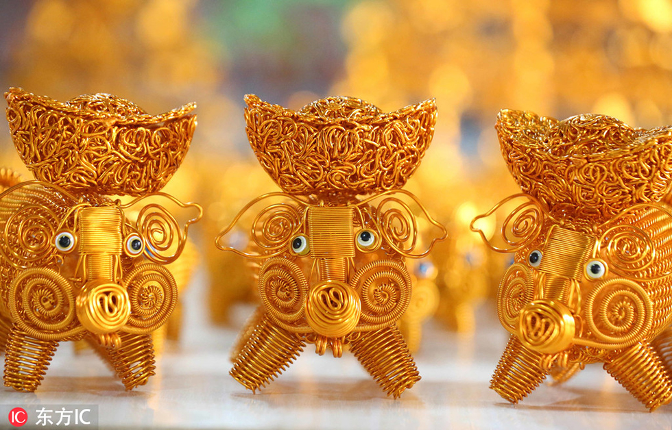 Tres obras en forma de cerdo tejidas en aluminio por el artista popular CaiZhaowang en Linyi, provincia de Shandong, 26 de diciembre de 2018. [Foto / IC]