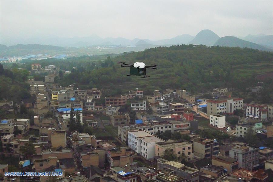 GUIZHOU, diciembre 28, 2018 (Xinhua) -- Imagen del 10 de mayo de 2018, de un dron transportando paquetes mientras despega de una sucursal de una oficina posal en la municipalidad de Weicheng, en la ciudad de Qingzhen, en la provincia de Guizhou, en el suroeste de China. El sector de entregas express de China ha manejado 50 mil millones de paquetes en lo que va del a?o, informó el viernes la Oficina Postal Estatal. Impulsada por el comercio electrónico, la industria de entregas express vio un rápido crecimiento en los últimos 3 a?os, con el número de paquetes aumentando en 10 mil millones en promedio en cada uno de los últimos 3 a?os, dijo la oficina. China ha estado en el primer puesto en el mercado mundial en los últimos 3 a?os consecutivos, sobrepasando el monto de manejo combinado de economías desarrolladas como Estados Unidos, Japón y Europa. (Xinhua/Liu Xu)