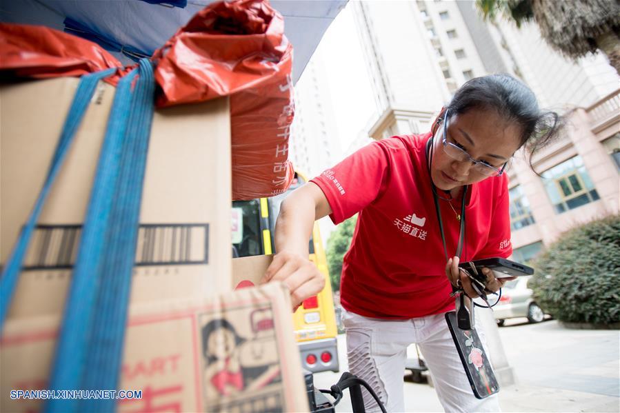 HUBEI, diciembre 28, 2018 (Xinhua) -- Imagen del 6 de agosto de 2018, de Liao Hongxia, una repartidora, confirmando las direcciones de paquetes en Wuhan, en la provincia central de Hubei, China. El sector de entregas express de China ha manejado 50 mil millones de paquetes en lo que va del a?o, informó el viernes la Oficina Postal Estatal. Impulsada por el comercio electrónico, la industria de entregas express vio un rápido crecimiento en los últimos 3 a?os, con el número de paquetes aumentando en 10 mil millones en promedio en cada uno de los últimos 3 a?os, dijo la oficina. China ha estado en el primer puesto en el mercado mundial en los últimos 3 a?os consecutivos, sobrepasando el monto de manejo combinado de economías desarrolladas como Estados Unidos, Japón y Europa. (Xinhua/Xiong Qi)