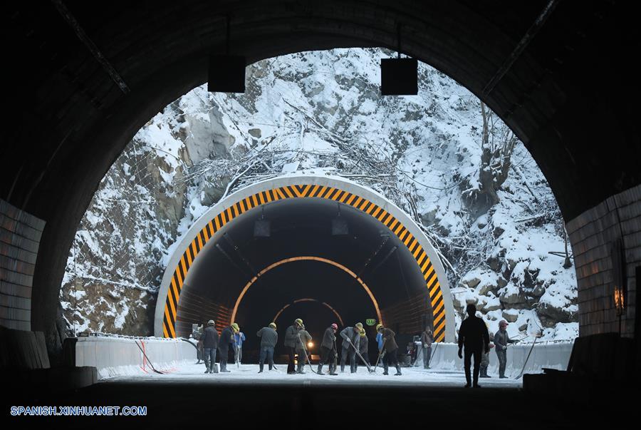 SICHUAN, diciembre 31, 2018 (Xinhua) -- Imagen del 30 de diciembre de 2018 de empleados limpiando nieve en un puente de túnel en la autopista Ya'an-Kangding, en la provincia de Sichuan, en el suroeste de China. Una autopista que conecta las ciudades de Ya'an y Kangding, en la provincia suroccidental china de Sichuan, inició operaciones de prueba el lunes, con lo que la longitud total de las autopistas en la provincia alcanzó los 7.238 kilómetros. La construcción de la autopista se completó nueve meses antes de lo previsto. Se trata de la segunda carretera hacia la Prefectura Autónoma tibetana de Ganzi después de la Carretera Nacional 318, que conduce a Lhasa, capital de la Región Autónoma del Tibet. La ruta recién completada permitirá a los viajeros ir de Chengdu a Kangding, capital de Ganzi, en solo tres horas y media. (Xinhua/Jiang Hongjing)
