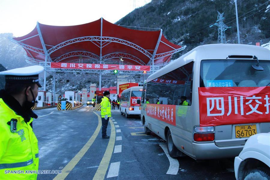 SICHUAN, diciembre 31, 2018 (Xinhua) -- Automóviles cruzan por la caseta de cobro de Kangding, para entrar a la autopista Ya'an-Kangding, en la provincia de Sichuan, en el suroeste de China, el 31 de diciembre de 2018. Una autopista que conecta las ciudades de Ya'an y Kangding, en la provincia suroccidental china de Sichuan, inició operaciones de prueba el lunes, con lo que la longitud total de las autopistas en la provincia alcanzó los 7.238 kilómetros. La construcción de la autopista se completó nueve meses antes de lo previsto. Se trata de la segunda carretera hacia la Prefectura Autónoma tibetana de Ganzi después de la Carretera Nacional 318, que conduce a Lhasa, capital de la Región Autónoma del Tibet. La ruta recién completada permitirá a los viajeros ir de Chengdu a Kangding, capital de Ganzi, en solo tres horas y media. (Xinhua/Jiang Hongjing)