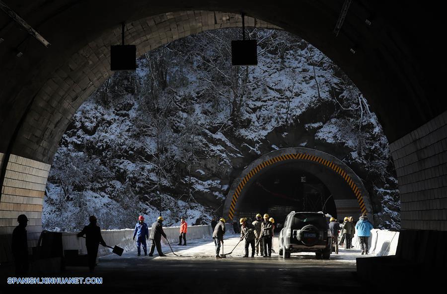 SICHUAN, diciembre 31, 2018 (Xinhua) -- Imagen del 30 de diciembre de 2018 de empleados limpiando nieve en un puente de túnel en la autopista Ya'an-Kangding, en la provincia de Sichuan, en el suroeste de China. Una autopista que conecta las ciudades de Ya'an y Kangding, en la provincia suroccidental china de Sichuan, inició operaciones de prueba el lunes, con lo que la longitud total de las autopistas en la provincia alcanzó los 7.238 kilómetros. La construcción de la autopista se completó nueve meses antes de lo previsto. Se trata de la segunda carretera hacia la Prefectura Autónoma tibetana de Ganzi después de la Carretera Nacional 318, que conduce a Lhasa, capital de la Región Autónoma del Tibet. La ruta recién completada permitirá a los viajeros ir de Chengdu a Kangding, capital de Ganzi, en solo tres horas y media. (Xinhua/Jiang Hongjing)