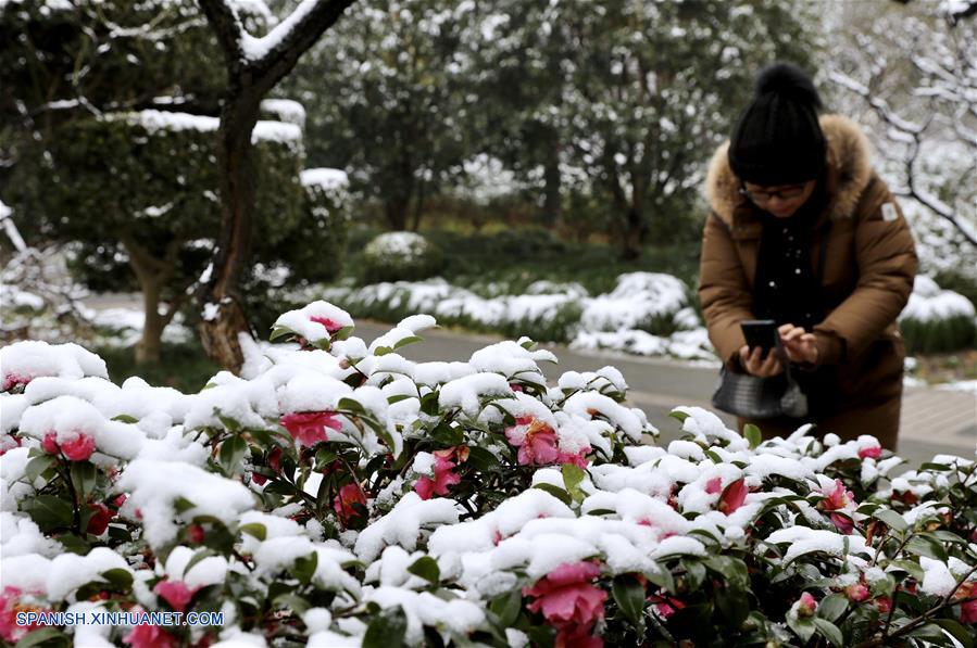 SHANGHAI, diciembre 31, 2018 (Xinhua) -- Una mujer toma fotografías a flores después de una nevada en Shanghai, en el este de China, el 31 de diciembre de 2018. (Xinhua/Liu Ying)