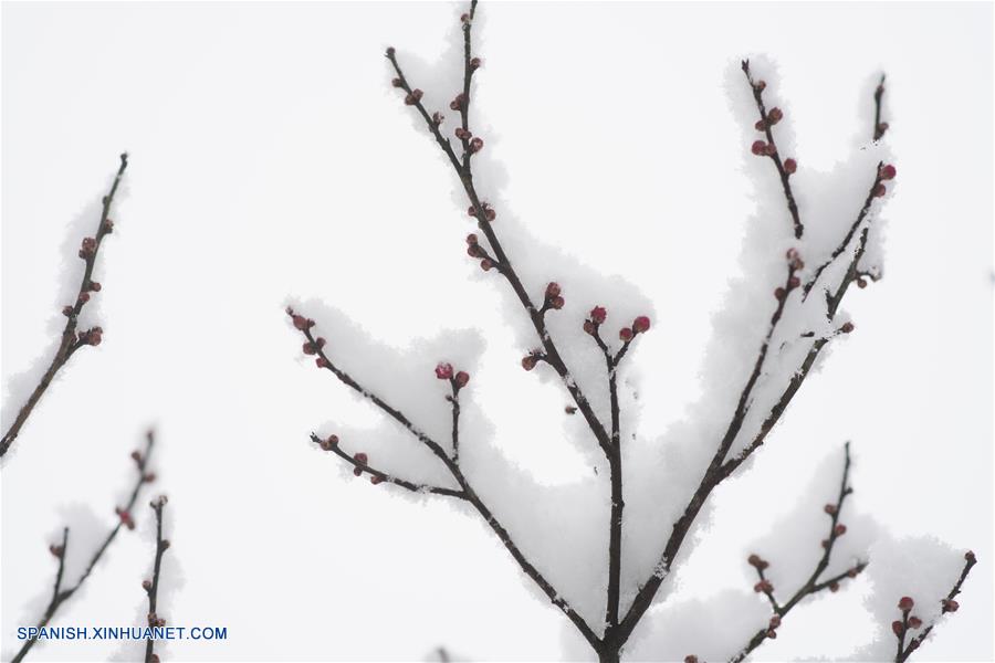 ZHEJIANG, diciembre 31, 2018 (Xinhua) -- Ciruelas rojas permanecen cubiertas por nieve en el Parque Longshan, en la ciudad de Shaoxing, en la provincia de Zhejiang, en el este de China, el 31 de diciembre de 2018. Una nevada afectó a Zhejiang el lunes. (Xinhua/Weng Xinyang)