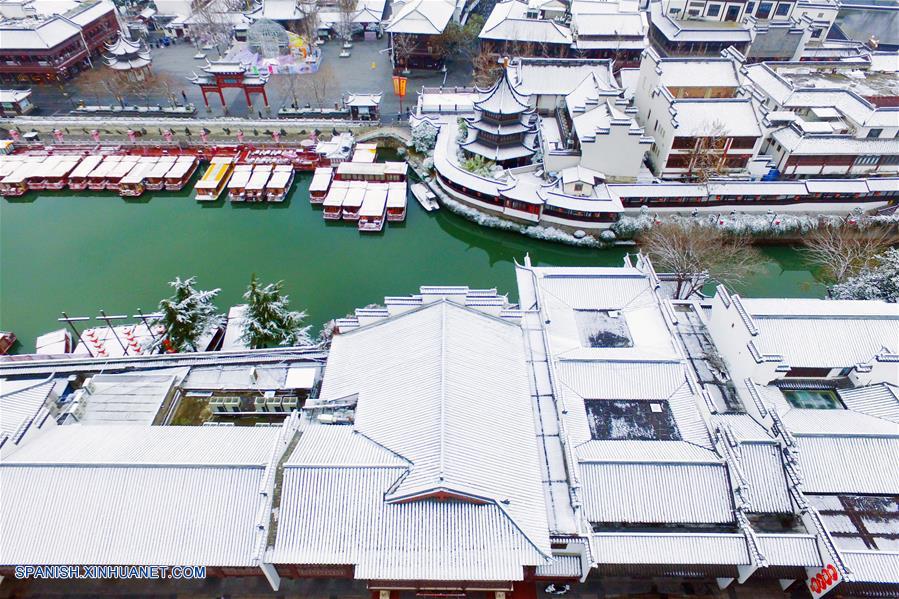 JIANGSU, diciembre 31, 2018 (Xinhua) -- Vista aérea de edificios cubiertos de nieve en el Templo Resort de Confucio en Nanjing, capital de la provincia Jiangsu, en el este de China, el 31 de diciembre de 2018. (Xinhua/Fang Dongxu)