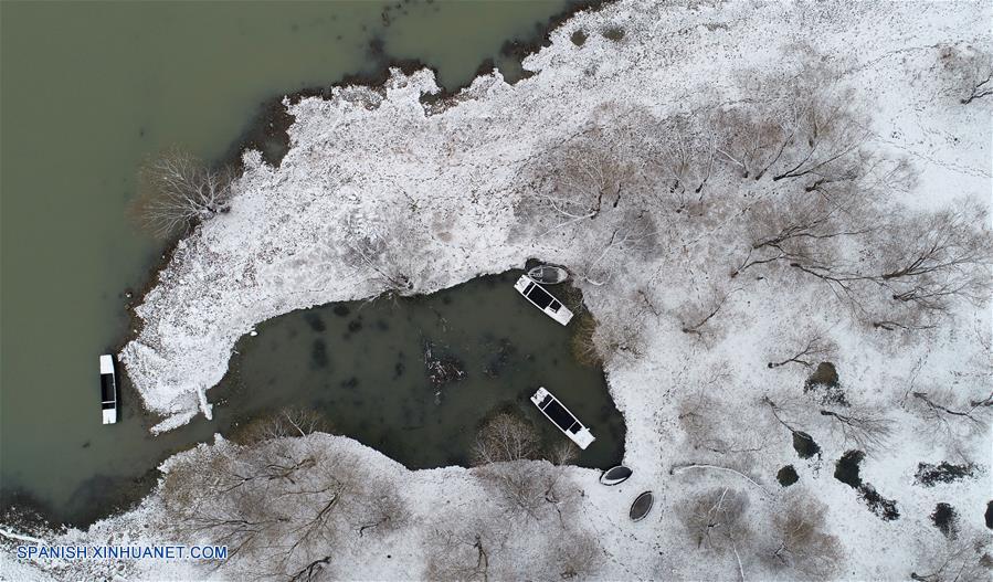 ANHUI, diciembre 31, 2018 (Xinhua) -- Vista aérea del paisaje nevado en un muelle en el poblado de Sanbing, en la ciudad de Chaohu, en la provincia de Anhui, en el este de China, el 31 de diciembre de 2018. (Xinhua/Ma Fengcheng)