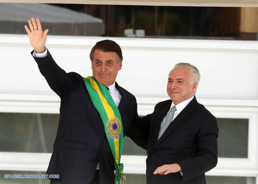 BRASILIA, enero 1, 2019 (Xinhua) -- Imagen proveída por AGENCIA ESTADO, del presidente de Brasil, Jair Bolsonaro (i), saludando después de recibir la banda presidencial de manos del presidente saliente de Brasil, Michel Temer (d), en el Palacio de Planalto, en Brasilia, Brasil, el 1 de enero de 2019. Jair Bolsonaro, del Partido Social Liberal (PSL), juró el martes a las 15:10 hora local (17:10 GMT) como nuevo presidente de Brasil para un mandato de 4 a?os, en ceremonia realizada en el Congreso Nacional, en la ciudad de Brasilia. (Xinhua/Célio Messias/AGENCIA ESTADO)