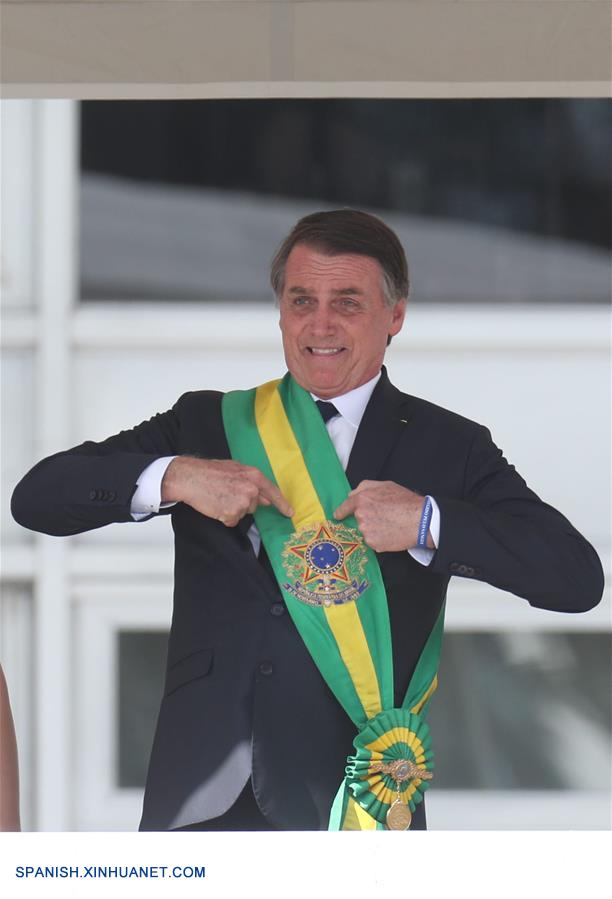 BRASILIA, enero 1, 2019 (Xinhua) -- Imagen proveída por AGENCIA ESTADO, del presidente de Brasil, Jair Bolsonaro, reaccionando después de recibir la banda presidencial de manos del presidente saliente de Brasil, Michel Temer, durante la ceremonia de toma de posesión en el Palacio de Planalto, en Brasilia, Brasil, el 1 de enero de 2019. Jair Bolsonaro, del Partido Social Liberal (PSL), juró el martes a las 15:10 hora local (17:10 GMT) como nuevo presidente de Brasil para un mandato de 4 a?os, en ceremonia realizada en el Congreso Nacional, en la ciudad de Brasilia. (Xinhua/Célio Messias/AGENCIA ESTADO)