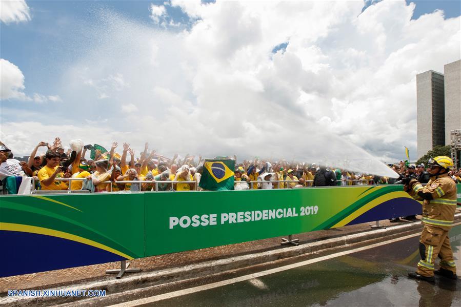 BRASILIA, enero 1, 2019 (Xinhua) -- Imagen cedida por la Presidencia de Brasil de bomberos de Brasilia rociando agua sobre los simpatizantes para atenuar el calor mientras aguardan el comienzo de la ceremonia de toma de posesión del presidente electo de Brasil, Jair Bolsonaro, en Brasilia, Brasil, el 1 de enero de 2019. Jair Bolsonaro, del Partido Social Liberal (PSL), juró el martes a las 15:10 hora local (17:10 GMT) como nuevo presidente de Brasil para un mandato de 4 a?os, en ceremonia realizada en el Congreso Nacional, en la ciudad de Brasilia. (Xinhua/Clauber Cleber Caetano/Presidencia de Brasil)