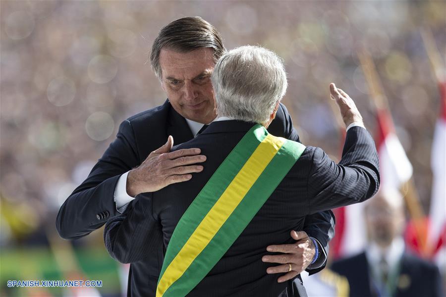 BRASILIA, enero 1, 2019 (Xinhua) -- El presidente electo de Brasil, Jair Bolsonaro (i), se abraza con el presidente de Brasil, Michel Temer (d), previo a la ceremonia de transmisión de mando, en el Palacio de Planalto, en Brasilia, Brasil, el 1 de enero de 2019. Jair Bolsonaro, del Partido Social Liberal (PSL), juró el martes a las 15:10 hora local (17:10 GMT) como nuevo presidente de Brasil para un mandato de 4 a?os, en ceremonia realizada en el Congreso Nacional, en la ciudad de Brasilia. (Xinhua/Li Ming)
