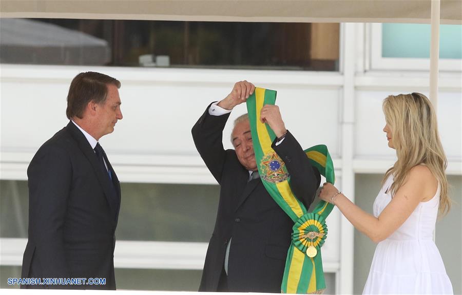 BRASILIA, enero 1, 2019 (Xinhua) -- Imagen proveída por AGENCIA ESTADO, del presidente saliente de Brasil, Michel Temer (c), retirándose la banda presidencial para colocársela al presidente entrante de Brasil, Jair Bolsonaro (i), durante la ceremonia de transmisión de mando, en el Palacio de Planalto, en Brasilia, Brasil, el 1 de enero de 2019. Jair Bolsonaro, del Partido Social Liberal (PSL), juró el martes a las 15:10 hora local (17:10 GMT) como nuevo presidente de Brasil para un mandato de 4 a?os, en ceremonia realizada en el Congreso Nacional, en la ciudad de Brasilia. (Xinhua/Célio Messias/AGENCIA ESTADO)