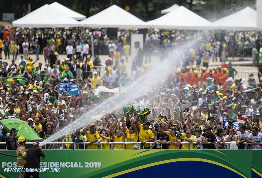 BRASILIA, enero 1, 2019 (Xinhua) -- Un bombero rocía agua a la audiencia previo a la ceremonia de transmisión de mando, en el Palacio de Planalto, en Brasilia, Brasil, el 1 de enero de 2019. Jair Bolsonaro, del Partido Social Liberal (PSL), juró el martes a las 15:10 hora local (17:10 GMT) como nuevo presidente de Brasil para un mandato de 4 a?os, en ceremonia realizada en el Congreso Nacional, en la ciudad de Brasilia. (Xinhua/Li Ming)