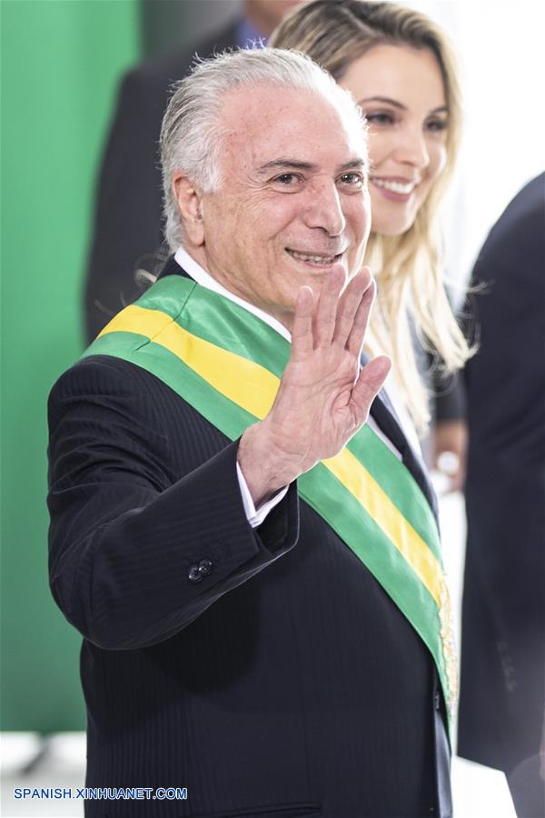 BRASILIA, enero 1, 2019 (Xinhua) -- El presidente de Brasil, Michel Temer, saluda a la audiencia previo a la ceremonia de transmisión de mando, en el Palacio de Planalto, en Brasilia, Brasil, el 1 de enero de 2019. Jair Bolsonaro, del Partido Social Liberal (PSL), juró el martes a las 15:10 hora local (17:10 GMT) como nuevo presidente de Brasil para un mandato de 4 a?os, en ceremonia realizada en el Congreso Nacional, en la ciudad de Brasilia. (Xinhua/Li Ming)