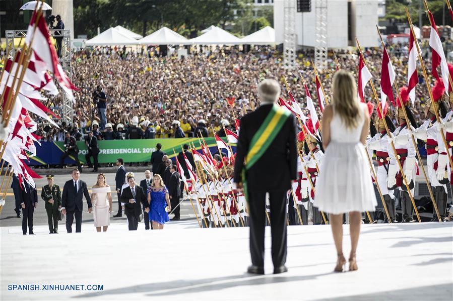 BRASILIA, enero 1, 2019 (Xinhua) -- El presidente de Brasil, Michel Temer (i-frente) y la primera dama, Marcela Temer (d-frente), esperan al presidente electo brasile?o, Jair Bolsonaro (3-i), y su esposa Michelle Bolsonaro (4-i) y al vicepresidente Hamilton Mourao (4-d), con su esposa Paula Mourao (3-d) previo a la ceremonia de transmisión de mando, en el Palacio de Planalto, en Brasilia, Brasil, el 1 de enero de 2019. Jair Bolsonaro, del Partido Social Liberal (PSL), juró el martes a las 15:10 hora local (17:10 GMT) como nuevo presidente de Brasil para un mandato de 4 a?os, en ceremonia realizada en el Congreso Nacional, en la ciudad de Brasilia. (Xinhua/Li Ming)