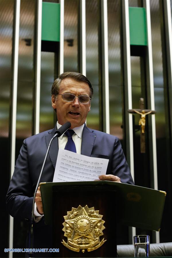 BRASILIA, enero 1, 2019 (Xinhua) -- Imagen cedida por la Presidencia de Brasil, del presidente electo brasile?o, Jair Bolsonaro, pronunciando un discurso durante la apertura de la sesión solemne de su toma de posesión, en Brasilia, Brasil, el 1 de enero de 2019. Jair Bolsonaro, del Partido Social Liberal (PSL), juró el martes a las 15:10 hora local (17:10 GMT) como nuevo presidente de Brasil para un mandato de 4 a?os, en ceremonia realizada en el Congreso Nacional, en la ciudad de Brasilia. (Xinhua/Isac Nobrega/Presidencia de Brasil)