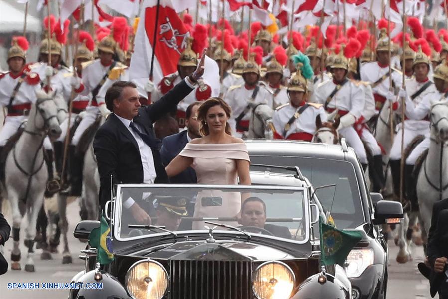 BRASILIA, enero 1, 2019 (Xinhua) -- Imagen proveída por AGENCIA ESTADO, del presidente electo de Brasil, Jair Bolsonaro (c-i), acompa?ado por su esposa Michelle Bolsonaro (c-d), dirigiéndose al Congreso Nacional, en Brasilia, Brasil, el 1 de enero de 2019. Jair Bolsonaro, del Partido Social Liberal (PSL), juró el martes a las 15:10 hora local (17:10 GMT) como nuevo presidente de Brasil para un mandato de 4 a?os, en ceremonia realizada en el Congreso Nacional, en la ciudad de Brasilia. (Xinhua/Gabriela Biló/AGENCIA ESTADO)