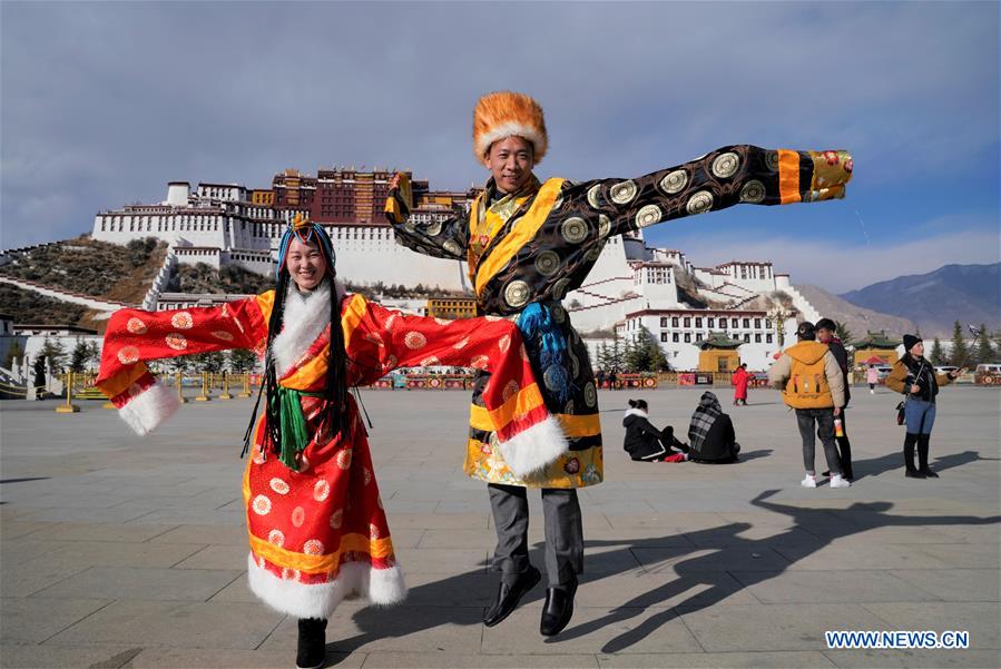 Turistas se toman fotografías en la plaza del Palacio de Potala en Lhasa, capital de la Región Autónoma del Tíbet, el 1 de enero del 2019. En toda China, se celebraron actividades en saludo al a?o nuevo. (Foto: Xinhua/ Purbu Zhaxi)