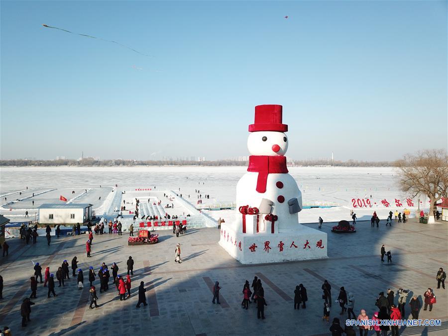 HEILONGJIANG, enero 2, 2019 (Xinhua) -- Vista aérea de personas observando esculturas de mu?ecos de nieve en la orilla del río Songhua, en Harbin, capital de la provincia de Heilongjiang, en el noreste de China, el 2 de enero de 2019. En total 2,019 mu?ecos de nieve fueron exhibidos en el lugar para recibir el a?o 2019. (Xinhua/Wang Song)