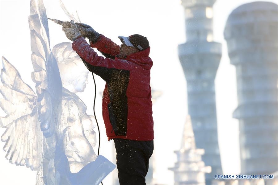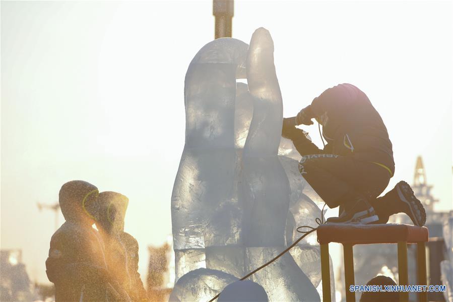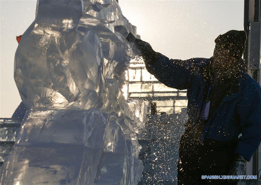 Una persona participa durante un concurso internacional de escultura de hielo, en Harbin, capital de la provincia de Heilongjiang, en el noreste de China, el 2 de enero de 2019. Un total de 16 equipos de 12 países y regiones participaron en el evento. (Xinhua/Wang Jianwei) (jg) (vf)