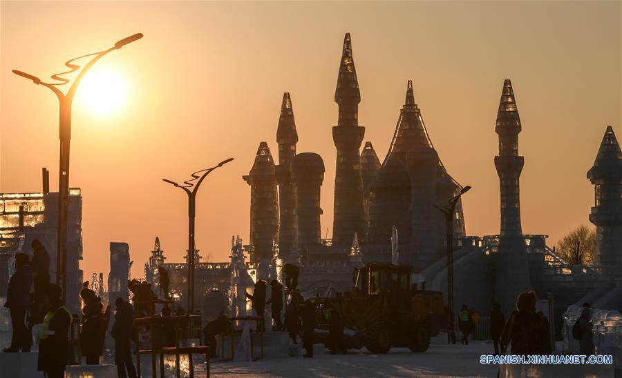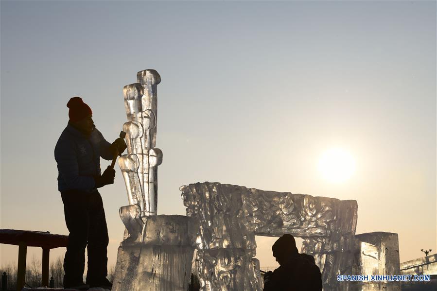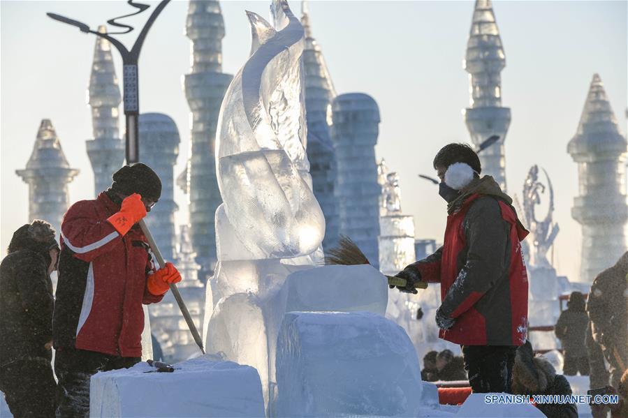 Personas participan durante un concurso internacional de escultura de hielo, en Harbin, capital de la provincia de Heilongjiang, en el noreste de China, el 2 de enero de 2019. Un total de 16 equipos de 12 países y regiones participaron en el evento. (Xinhua/Wang Song)