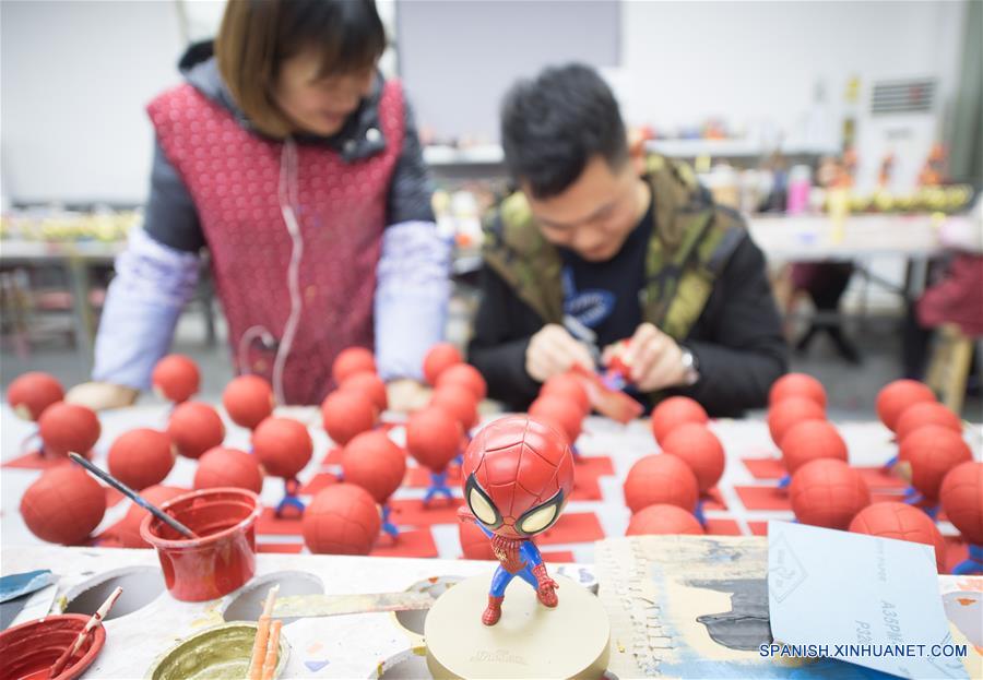 Artesanos elaboran obras de arte de cobre en el taller de una fábrica, en la ciudad de Jiande, provincia de Zhejiang, en el este de China, el 2 de enero de 2019. La empresa de producción de artículos sanitarios tradicionales, Tong Shifu, que significa maestro del cobre, se ha convertido en una empresa que dise?a y fabrica obras de arte de cobre en colaboración con un museo, una firma de dibujos animados y un estudio de artista. Con la producción anual alcanzando los 500 millones de yuanes (aproximadamente 72.9 millones de dólares estadounidenses), la campa?ía ha tenido éxito en la tranformación industrial. (Xinhua/Weng Xinyang)