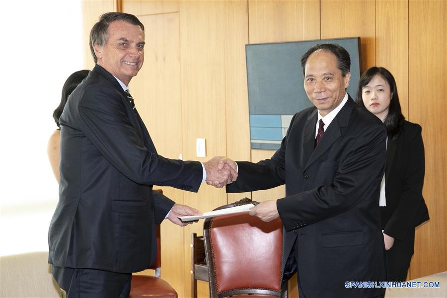 El enviado especial del presidente chino Xi Jinping, Ji Bingxuan (d-frente), también vicepresidente del Comité Permanente de la Asamblea Popular Nacional, entrega una carta firmada por Xi Jinping al presidente brasile?o, Jair Bolsonaro, en Brasilia, Brasil, el 2 de enero de 2019. Ji Bingxuan asistió a la ceremonia de investidura de Jair Bolsonaro aquí el martes. (Xinhua/Li Ming)