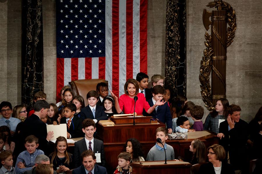 WASHINGTON D.C., enero 3, 2019 (Xinhua) -- Nancy Pelosi (c) reacciona junto a ni?os luego de ser elegida como nueva presidenta de la Cámara de Representantes estadounidense, en el Capitolio, en Washington D.C., Estados Unidos, el 3 de enero de 2019. La representante Nancy Pelosi, demócrata por California, fue elegida el jueves como nueva presidenta de la Cámara de Representantes de Estados Unidos en el primer día de un nuevo y dividido Congreso. (Xinhua/Ting Shen)
