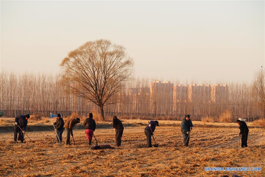 HEBEI, enero 3, 2019 (Xinhua) -- Imagen del 7 de diciembre de 2018 de residentes trabajando en el campo de arroz, en el condado de Anxin de la Nueva Area de Xiongan, provincia de Hebei, en el norte de China. Las autoridades centrales de China han aprobado el plan maestro 2018-2035 para la Nueva Area de Xiongan, destacando que su creación es importante para el desarrollo de alta calidad y la construcción del sistema económico moderno. El plan fue aprobado por el Comité Central del Partido Comunista de China (PCCh) y el Consejo de Estado, el gabinete del país. El plan maestro 2018-2035 para la Nueva Area de Xiongan es importante para convertir a Xiongan en el modelo nacional de desarrollo de alta calidad y en un nuevo motor para el sistema económico moderno, de acuerdo con un documento publicado el miércoles después de la aprobación. (Xinhua/Xing Guangli)