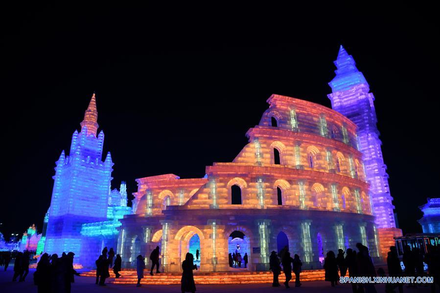 Turistas visitan el Mundo de Hielo y Nieve, en Harbin, capital de la provincia de Heilongjiang, en el noreste de China, el 5 de enero de 2019. El 35 Festival Internacional de Hielo y Nieve de Harbin comenzó el sábado. (Xinhua/Wang Jianwei)