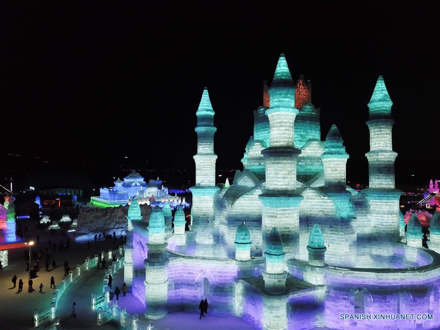 Turistas visitan el Mundo de Hielo y Nieve, en Harbin, capital de la provincia de Heilongjiang, en el noreste de China, el 5 de enero de 2019. El 35 Festival Internacional de Hielo y Nieve de Harbin comenzó el sábado. (Xinhua/Wang Song)