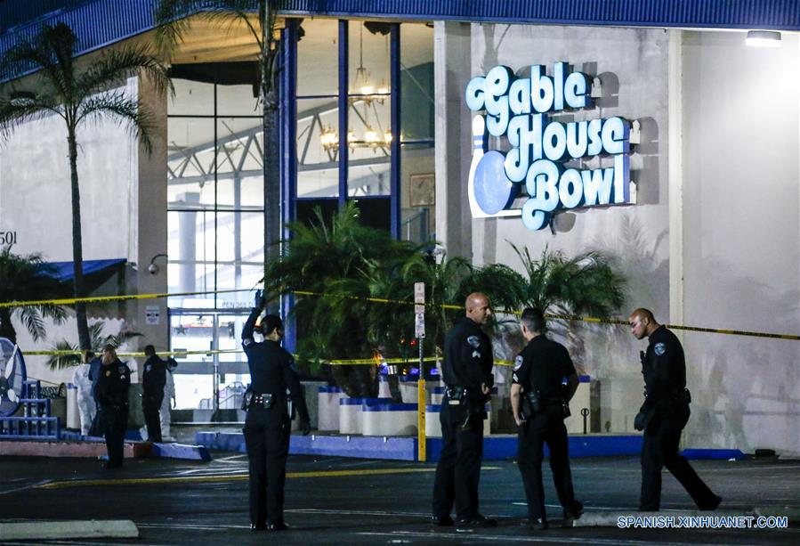 Oficiales de policía trabajan en el lugar donde se registró un tiroteo, en Torrance, en el estado de California, Estados Unidos, el 5 de enero de 2019. Tres personas murieron en un tiroteo en la bolera Gable House Bowl en la ciudad costera de Torrance, cerca de Los Angeles, dijo la Policía. Se han puesto en marcha las investigaciones pertinentes y urgió al público a mantenerse lejos del área, según la policía. (Xinhua/Zhao Hanrong)
