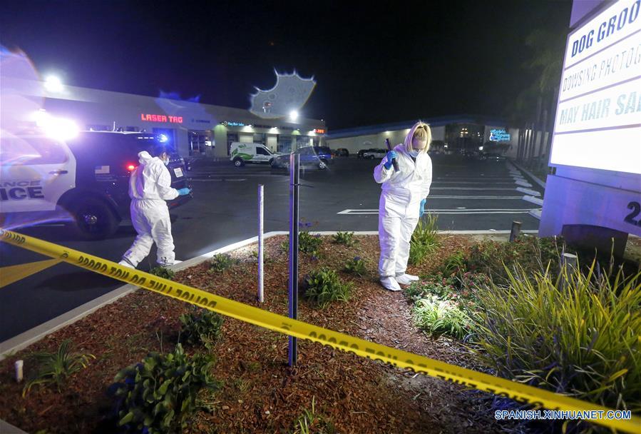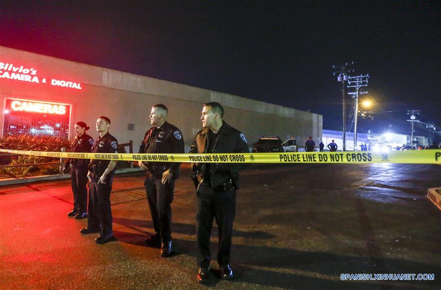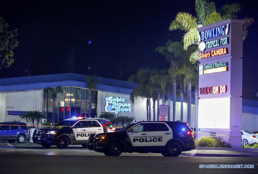 Oficiales de la policía trabajan en el lugar donde se registró un tiroteo, en Torrance, en el estado de California, Estados Unidos, el 5 de enero de 2019. Tres personas murieron en un tiroteo en la bolera Gable House Bowl en la ciudad costera de Torrance, cerca de Los Angeles, dijo la Policía. Se han puesto en marcha las investigaciones pertinentes y urgió al público a mantenerse lejos del área, según la policía. (Xinhua/Zhao Hanrong)