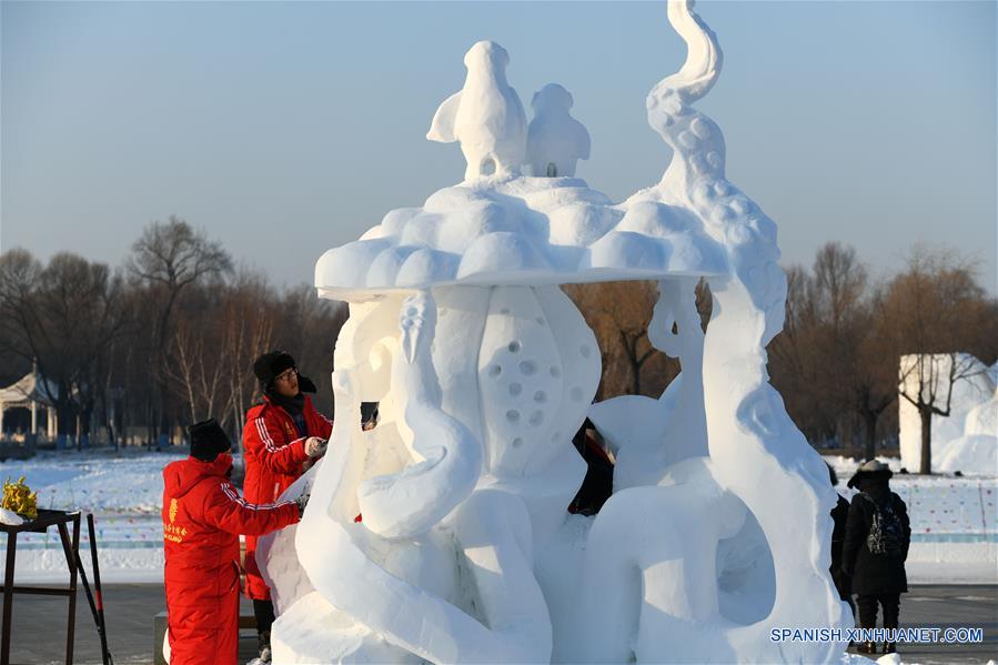 Participantes elaboran una escultura de nieve en el Parque Internacional de Exposiciones de Arte de Escultura de Nieve Isla del Sol, en Harbin, provincia de Heilongjiang, en el noreste de China, el 6 de enero de 2019. Un concurso de esculturas de nieve de cuatro días de duración de estudiantes universitarios fue inaugurado el viernes, atrayendo a 70 participantes de 17 universidades de China. (Xinhua/Wang Song)
