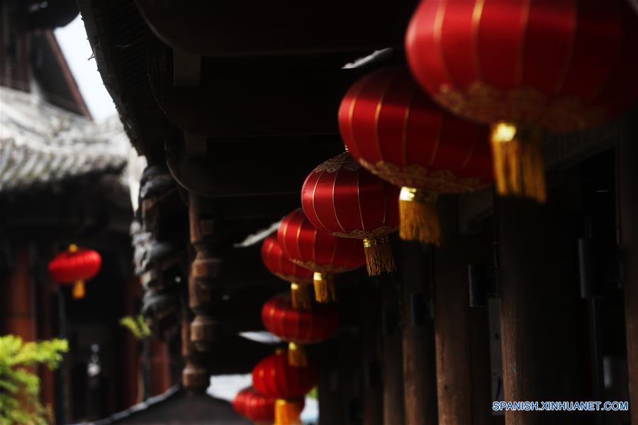 Vista de las decoraciones de festival para recibir el A?o Nuevo Lunar en la ciudad antigua de Zhuoshui, en el distrito de Qianjiang, en Chongqing, en el suroeste de China, el 6 de enero de 2018. (Xinhua/Yang Min)