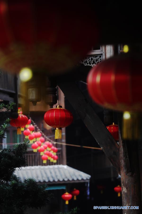Vista de las decoraciones de festival para recibir el A?o Nuevo Lunar en la ciudad antigua de Zhuoshui, en el distrito de Qianjiang, en Chongqing, en el suroeste de China, el 6 de enero de 2018. (Xinhua/Yang Min)