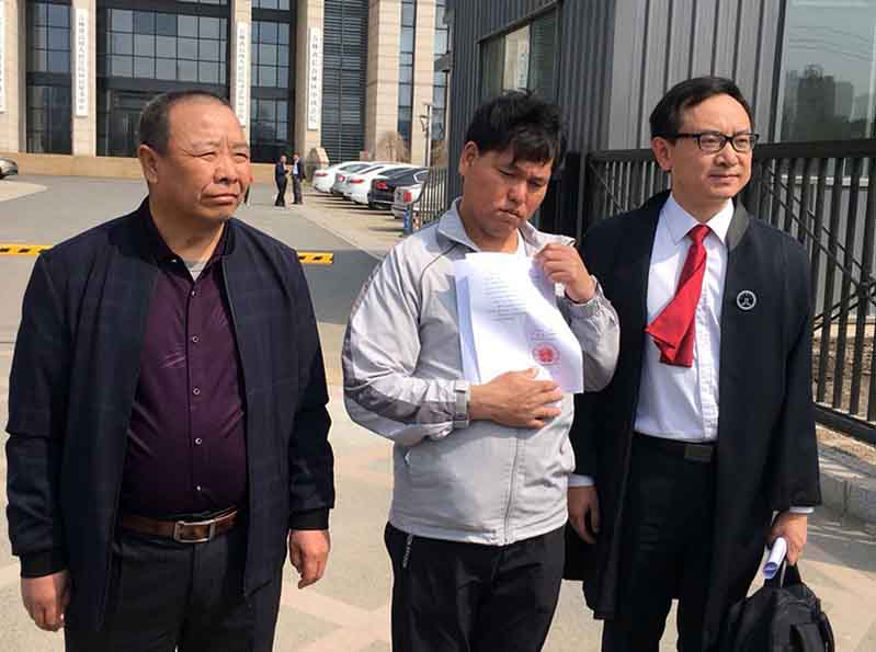 Liu Zhonglin (centro) muestra un certificado que dicta su inocencia después de un nuevo juicio en el Tribunal Popular Superior Provincial de Jilin. A su izquierda, el abogado Zhang Yupeng, quien ayudó a anular la condena errónea de Liu en 1994 por homicidio. [Foto por Yuan Jingwei / Para China Daily]