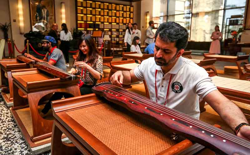 Los extranjeros aprenden a tocar el guzheng, un instrumento clásico chino, en un centro de turismo de salud de Qionghai, provincia de Hainan. Aquí los visitantes pueden recibir tratamientos basados en la medicina y cultura chinas. [Foto: Yuan Chen/ China Daily]