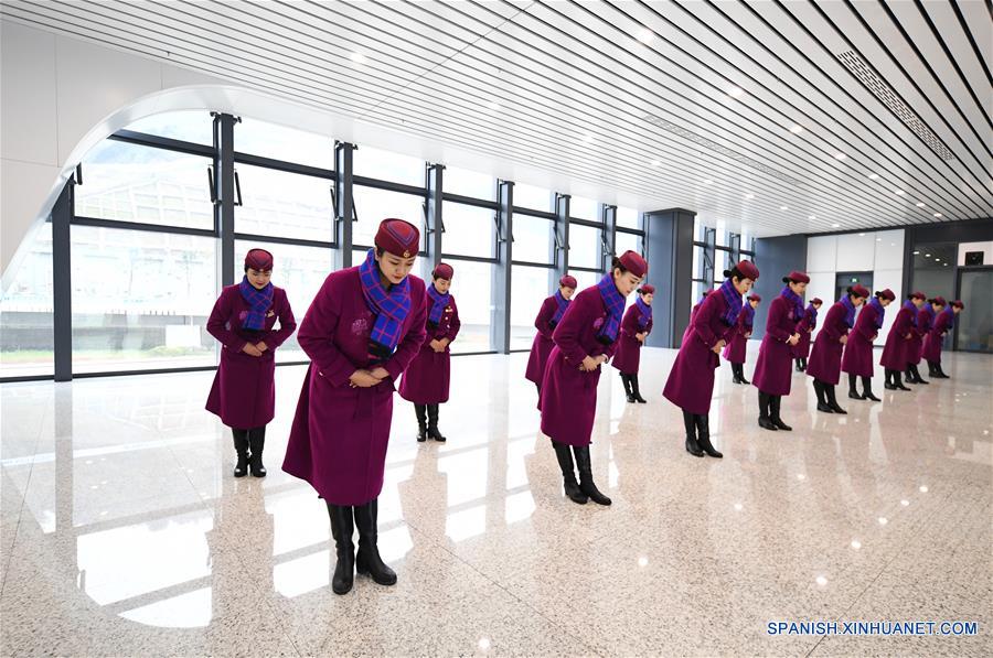 Asistentes de viaje reciben entrenamiento de etiqueta, en Chongqing, en el suroeste de China, el 8 de enero de 2019. Los empleados de la compa?ía China Railway Chengdu Group Co., Ltd. están ocupados preparándose para la temporada alta de viajes del Festival de la Primavera anual, que se espera dure del 21 de enero al 1 de marzo de 2019. (Xinhua/Wang Quanchao)