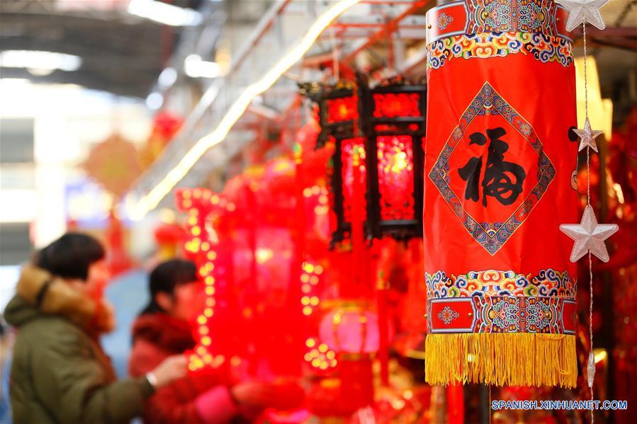Clientes seleccionan decoraciones de A?o Nuevo en un mercado, en el distrito de Jimo de Qingdao, provincia de Shandong, en el este de China, el 8 de enero de 2019. Las personas están ocupadas comprando decoraciones de A?o Nuevo para dar la bienvenida al próximo A?o Nuevo Lunar, que comienza desde el primer día del primer mes del calendario lunar chino, o el 5 de febrero este a?o. (Xinhua/Liang Xiaopeng) (jg) (ah)
