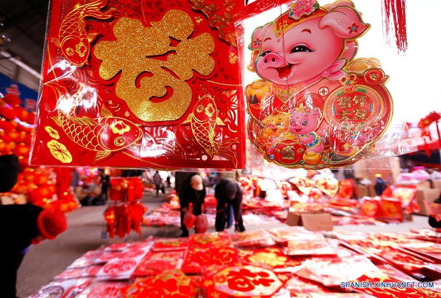 Vista de las decoraciones de A?o Nuevo exhibidas en un mercado, en el distrito de Jimo de Qingdao, provincia de Shandong, en el este de China, el 8 de enero de 2019. Las personas están ocupadas comprando decoraciones de A?o Nuevo para dar la bienvenida al próximo A?o Nuevo Lunar, que comienza desde el primer día del primer mes del calendario lunar chino, o el 5 de febrero este a?o. (Xinhua/Liang Xiaopeng)