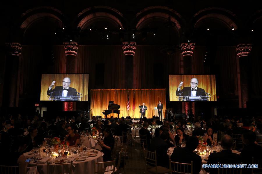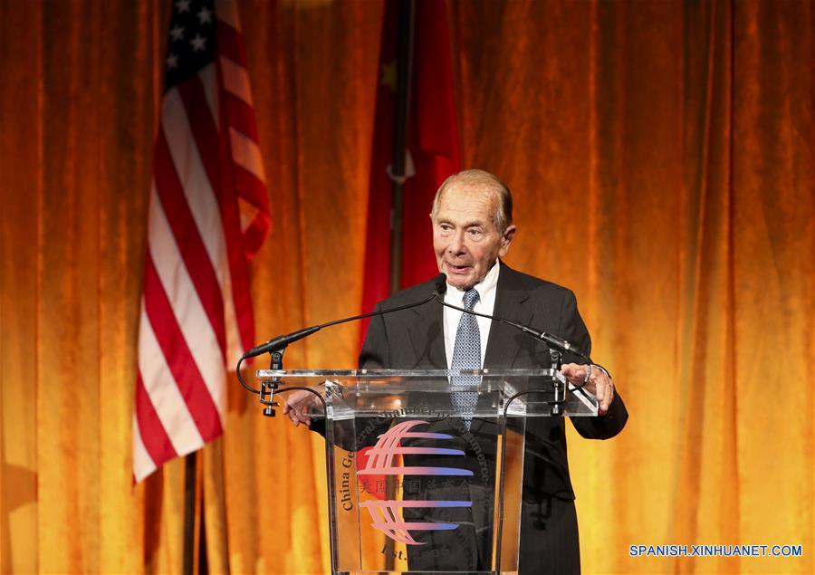 Imagen del 7 de enero de 2019 de Maurice R. Greenberg, ex presidente y director general del gigante estadounidense de los seguros American International Group (AIG), pronunciando un discurso después de recibir el título de "Embajador de Buena Voluntad para el Intercambio China-Estados Unidos" durante la gala por el A?o Nuevo Lunar Chino de 2019, en Nueva York, Estados Unidos. La Cámara General de Comercio de China, USA (CGCC-USA) llevó a cabo el lunes la gala por el A?o Nuevo Lunar Chino de 2019, en la que participaron representantes de los gobiernos y empresas de Estados Unidos y China. (Xinhua/Wang Ying)