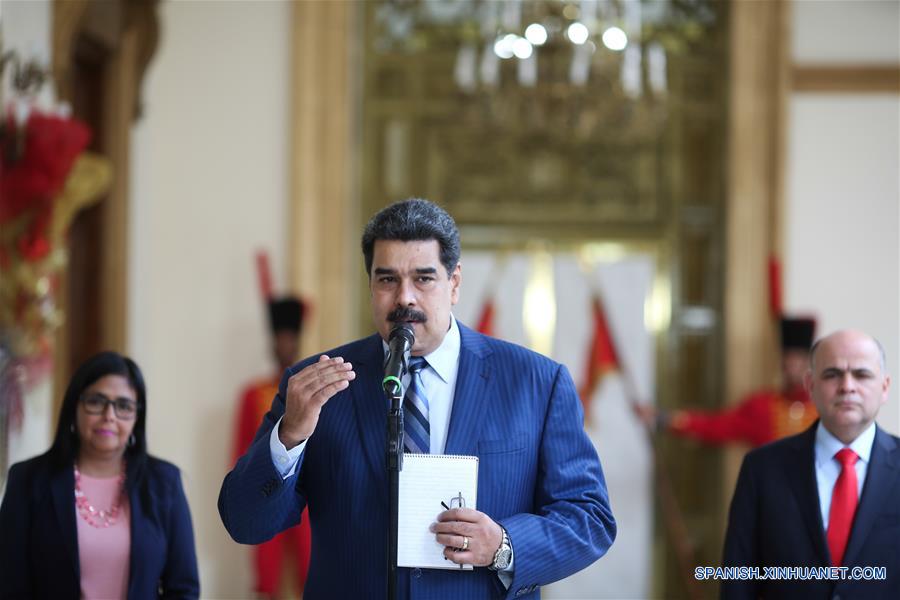 CARACAS, enero 7, 2019 (Xinhua) -- Imagen cedida por la Presidencia de Venezuela del presidente venezolano, Nicolás Maduro (c), realizando declaraciones ante la prensa, en el Palacio de Miraflores, en Caracas, Venezuela, el 7 de enero del 2019. La estatal Petróleos de Venezuela (PDVSA) y la empresa francesa Maurel & Prom firmaron el lunes un convenio por 400 millones de dólares para subir la producción de crudo en un campo del estado de Zulia, informó el presidente venezolano, Nicolás Maduro. (Xinhua/Presidencia de Venezuela)