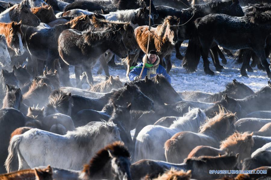 UJIMQIN, enero 8, 2019 (Xinhua) -- Un pastor doma caballos en la Bandera Ujimqin Oeste, en la Región Autónoma de Mongolia Interior, en el norte de China, el 8 de enero de 2019. (Xinhua/Liu Lei)